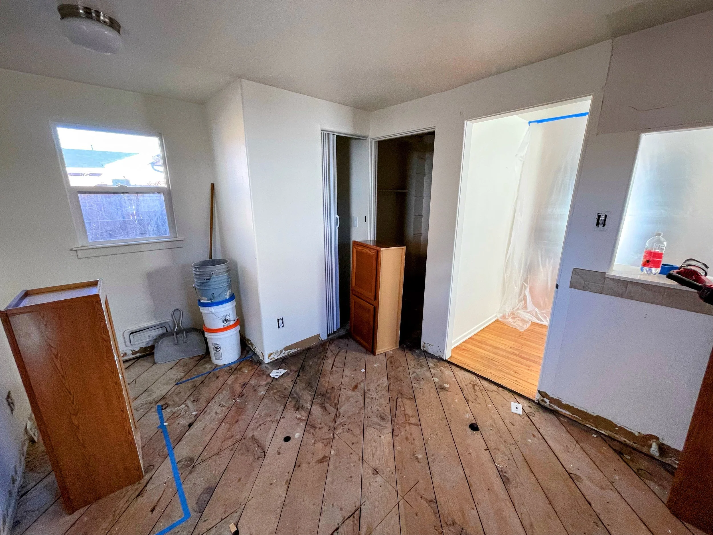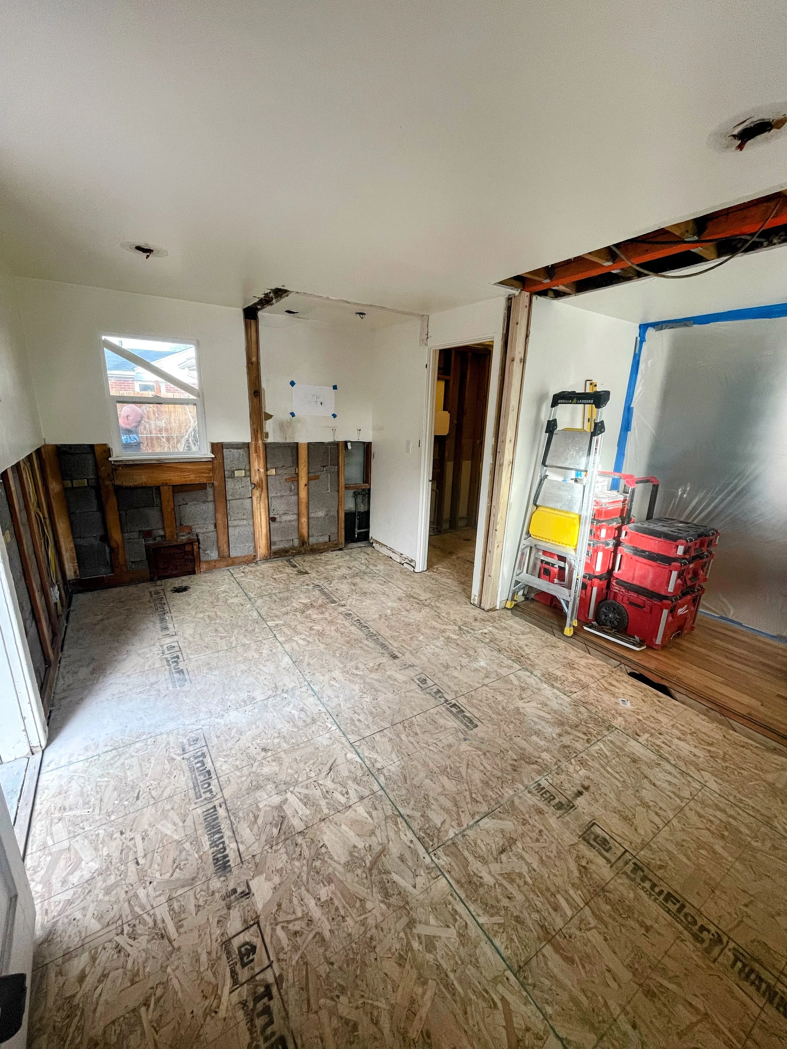 After some serious water damage ruined the flooring in this kitchen, we decided to open things up and add a powder bath and laundry area. New flooring, cabinetry, counter tops and lighting along with a tankless water heater to eliminate the utility closet and allow for more storage in the new kitchen.